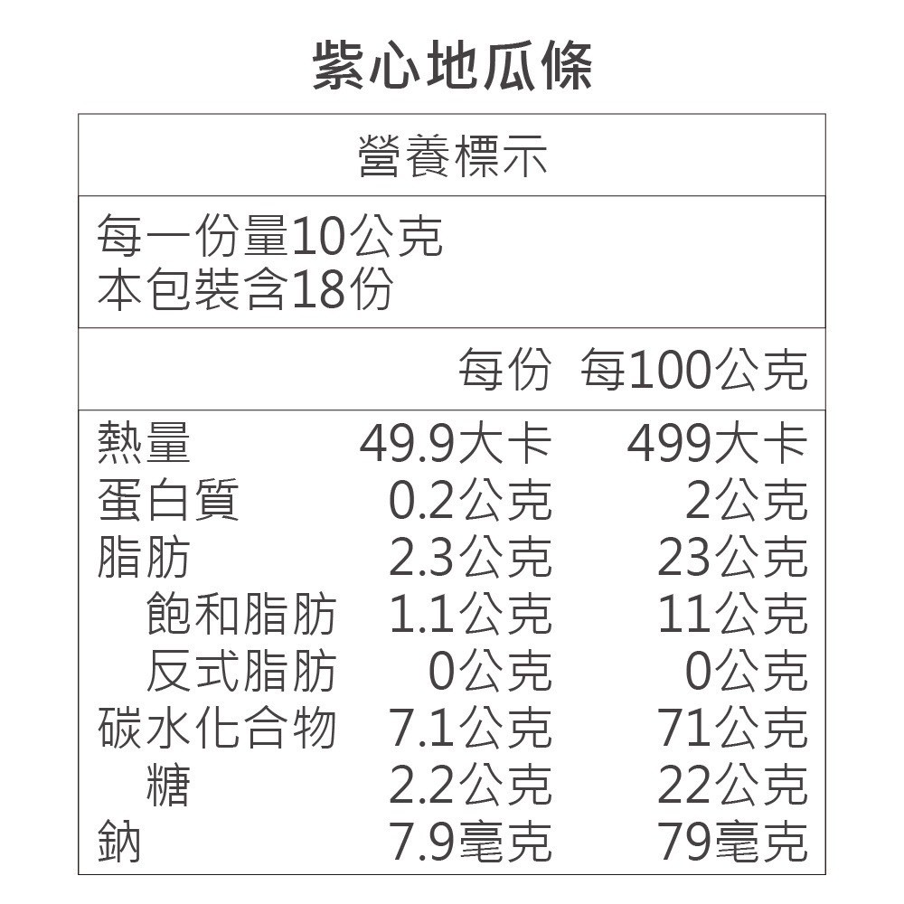 品名:紫心地瓜條(蔬食) 成分:新鮮地瓜、精製棕櫚油、糖、鹽 淨重:180公克±4.5% 產地:台灣 保存方式:保存於陰涼乾燥處,開封後請盡 快食用完畢 保存期限:5個月 製造日期:標示於包裝上(西元年/月/日) 有效日期:標示於包裝上(西元年/月/日)