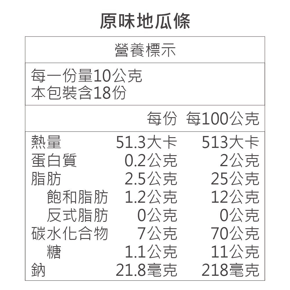 品名:原味地瓜條(蔬食) 成分:新鮮地瓜、精製棕櫚油、糖、鹽 淨重:180公克±4.5% 產地:台灣 保存方式:保存於陰涼乾燥處,開封後請盡 快食用完畢 保存期限:5個月 製造日期:標示於包裝上(西元年/月/日) 有效日期:標示於包裝上(西元年/月/日)