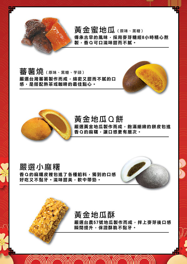 ★加入會員可享更優惠的會員價唷!★ 【商品說明】 精緻的禮盒綜合了多樣金山在地特色商品,年節送禮大方又實惠。 【出貨商品內容以下為主】 (如遇缺貨,隨機替換商品出貨) 黃金蜜地瓜X4 黃金地瓜Q餅X3 綜合蕃薯燒X6 黃金地瓜酥X7 嚴選小麻糬X7